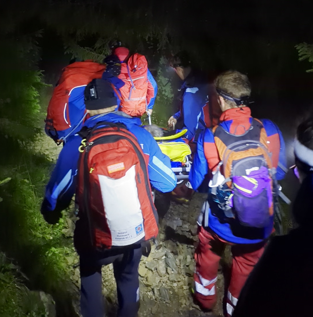 Nach der Erstversorgung der Patientin folgte der aufwändige Abtransport mit der Gebirgstrage durch rutschiges und steiniges Gelände.