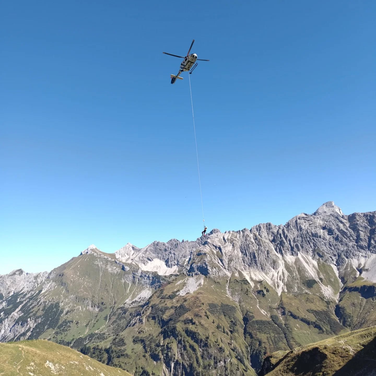 Nachdem die Notärztin des Gallus 1 im Schwebeflug aussteigen konnte, wurde der Landeplatz an unserer Hütte für die Zwischenlandung und Einbau des Rettungstaus genutzt. Der Luftretter, die Hubschrauber-Notärztin und der Patient wurden dann per Tau nach Hinterstein ausgeflogen bevor es weiter in die Klinik ging.